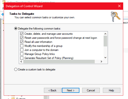 5. Open the Delegation of Control Wizard by right-clicking the domain Active Directory Users and Computers, and selecting All Tasks.